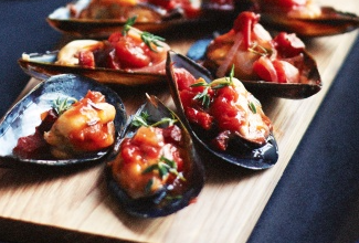 Печените миди с червен сос са чудесен и елегантен аперитив за вашата празнична вечер. Може да ги придружите с чаша бяло или червено вино.