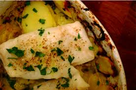 С приготвения сос заливаме рибата и картофите. Поставяме тавата в предварително загрята 180 градуса фурна и печем в продължение на 15-16 минути.