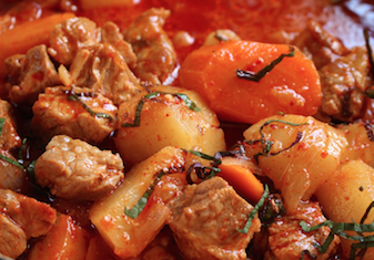 Когато омекне месото, добавяме картофите и морковите. Трябва да има толкова течност, колкото да покрие напълно картофите. Похлупваме отново с капака и оставяме да къкри за 25-35 минути, в случай че готвим в нормална тенджера, ако използваме тенджера под налягане са ни необходими само 10 минути.